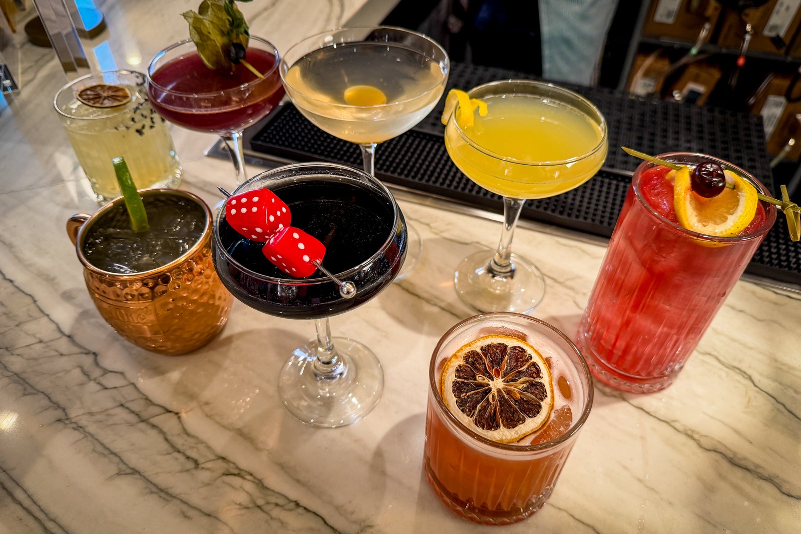 It wouldn’t be Vegas without some cocktails, so to that end, you might want to try the locally inspired Lucky 1700 — a dice-topped twist on the classic gimlet that’s jet black thanks to the addition of activated charcoal — and the Ready, Set, Go, a Formula 1 Las Vegas Grand Prix-inspired, vodka-based libation with a kick of apricot Red Bull.